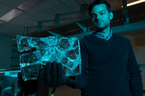 Conveniently for Robel, who explores ice dynamics with math, physics, and computer science, as ice shelves form, regimented matrices of surface dents appear in them, and that’s where the ponds collect.