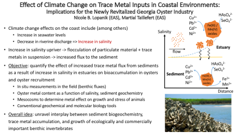 The effects of climate change on the coastal ocean include a decrease in riverine inputs and increase in salinity in estuaries with impacts on primary production, macrofauna, and sediment biogeochemistry that are poorly understood. One clear effect of the increase in salinity associated with the decrease in riverine discharge, however, is the enhanced coagulation of inorganic material further upriver. Flocculation of particulate material upriver will enhance its flux to the sediment and simultaneously decrease the outflux of particulate material to the continental shelf. Any trace metal contaminant brought to the coast via riverine inputs will be trapped in these particles and accumulated in the sediment where they may constitute a threat to estuarine ecosystems, including the shellfish industry, as crabs, shrimp, and oysters will be potentially affected by the release of trace metals into overlying waters upon dissolution of the carrying particles. This project will investigate how an increase in trace metal release from sediments may affect the metal content of oysters and oyster recruitment, as the oyster industry in Georgia has been recently revitalized. Field studies that investigate the metal content of animals on the coast and relate it to salinity and geochemical conditions in the underlying sediments will be conducted seasonally to investigate the role of sediment biogeochemistry on the flux of metals from the sediment-water interface. In addition, mesocosms will be set up to reproduce the effect of trace metal inputs in the overlying waters on animal growth and stress gene expression. This research will reveal the interplay between trace metal contaminations and sediment biogeochemistry on the growth of ecologically and commercially important benthic invertebrates.